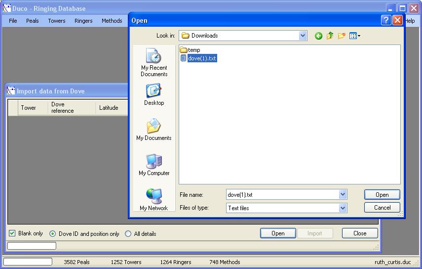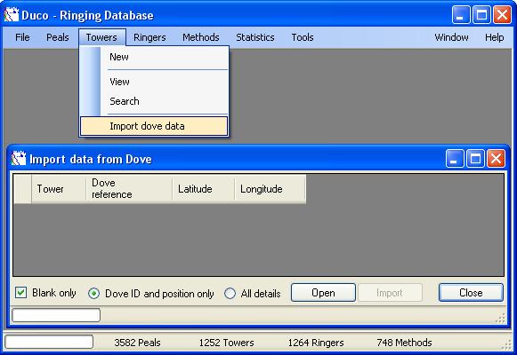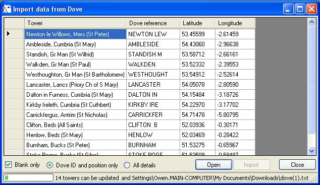 This next stage could take a few moments, first the data file is read, then Duco will attempt to match each tower without a Dove id to the Dove database, by number of bells, tenor weight, dedication, name and county.