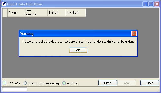 However, you shouldn't update all your tower data, unless you are sure all the dove references are correctly set. If they aren't you will over write the valid tower data with the data for a different tower. You can check for any towers which have the same Dove id as another tower by validating all the towers from the tools menu.