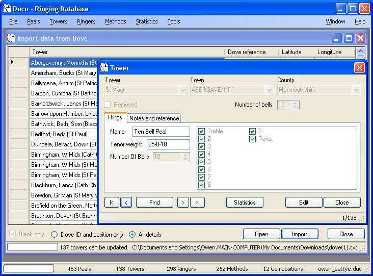 The only exception, is that towers which are marked as "Removed", won't be updated when you run this import, as Dove doesn't keep records of removed, or replaced peals of bells.