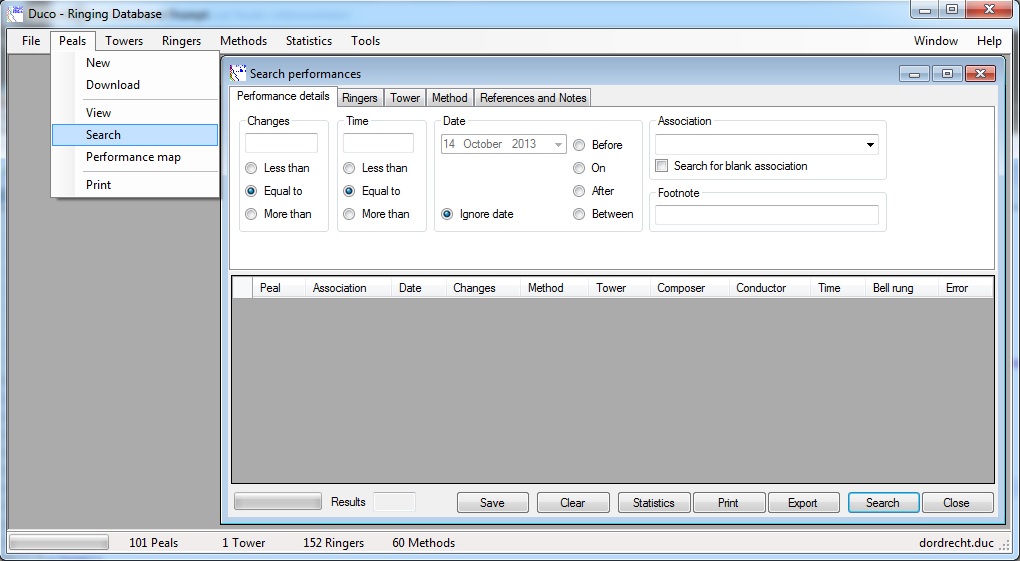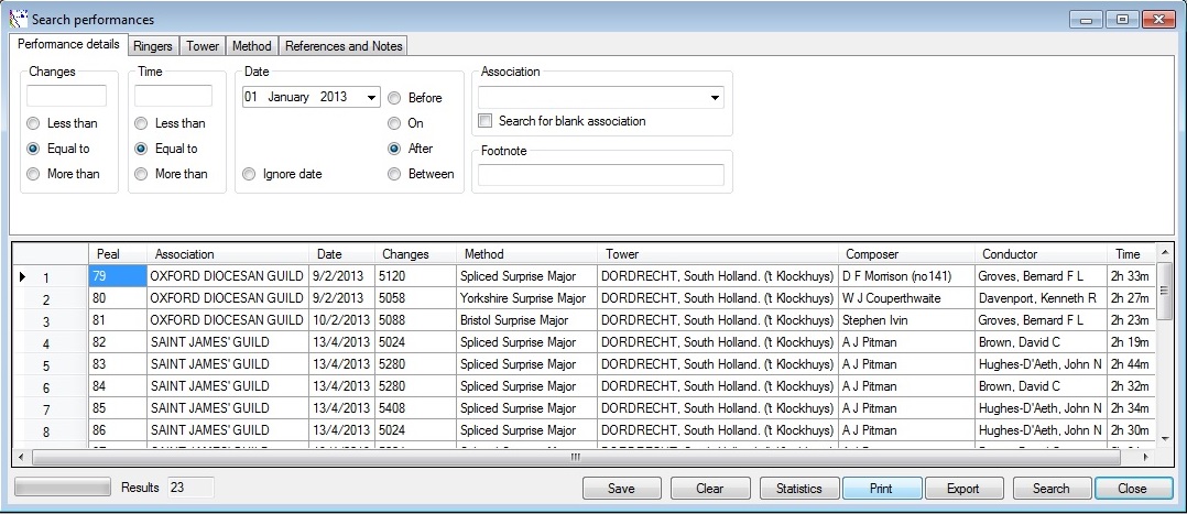A. First you need to use the peal or quarter search dialog, to find the list of performances you want to print.